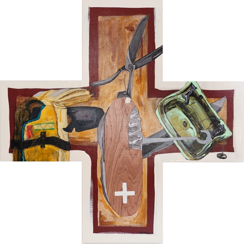 “The pocket knife is a symbol of order, planning and protection. The juxtaposition of the sink and the lifejacket begs the question, what do you need these objects for? The modern women must indeed be prepared for any situation but it is in the plus shapes gaps, the empty space, the unplanned lived experience that we can explore what we value most.” Katie Blundell Artist