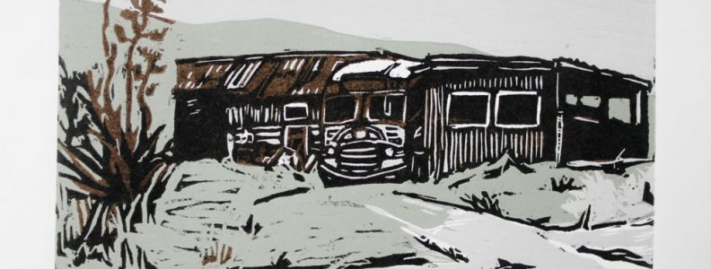 Title: Bus house Description: “The end of the world series was inspired by a trip to Ahipara, where I fell in love with the beauty and simplicity of these buildings in the environment and begged the question what do we need to be happy.” Katie Blundell 2010 |